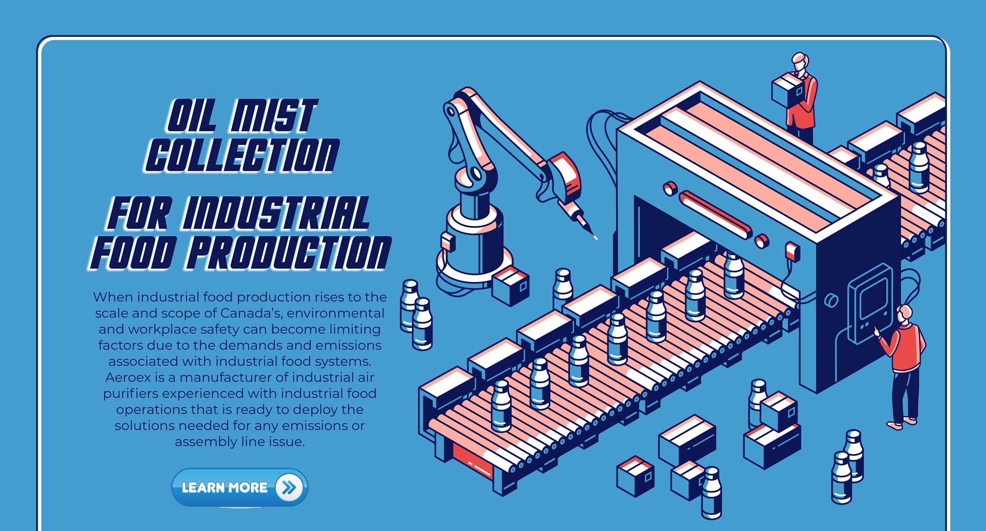 Industrial food production is Canada’s second-largest manufacturing sector, accounting for 17% of manufacturing sales in Canada and 2% of total GDP. Not only that, but according to the Government of Canada, food production is only going up, with the industry growing at a rate of approximately 6% per year. When industrial food production rises to the scale and scope of Canada’s, environmental and workplace safety can become limiting factors due to the demands and emissions associated with industrial food systems. Aeroex is a manufacturer of industrial air purifiers experienced with industrial food operations that is ready to deploy the solutions needed for any emissions or assembly line issue.
